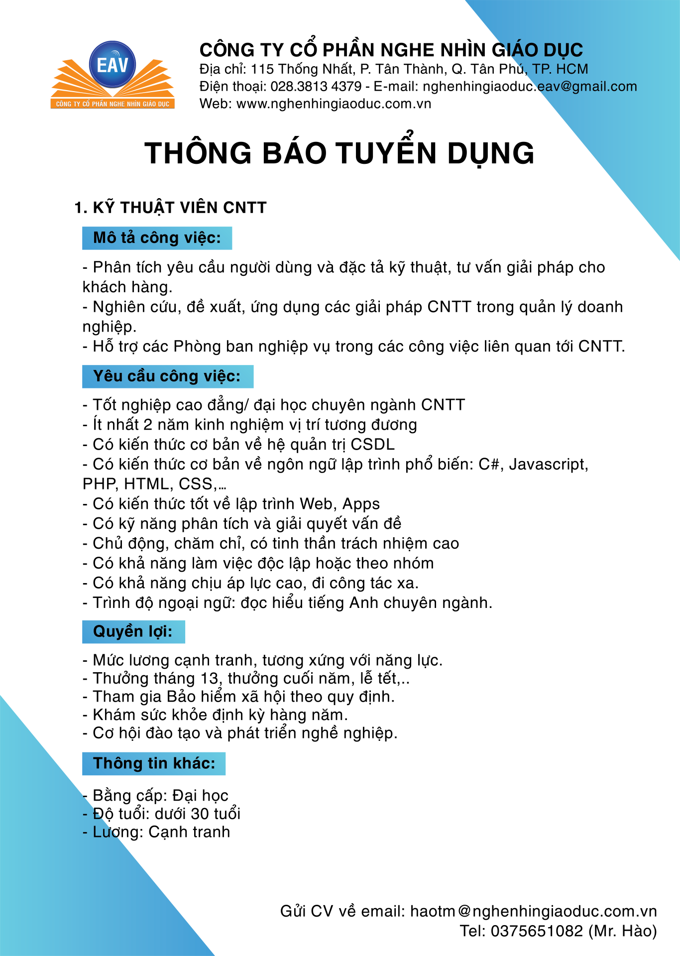 EAV cần tuyển dụng 01 nhân viên vị trí: Kỹ thuật viên CNTT