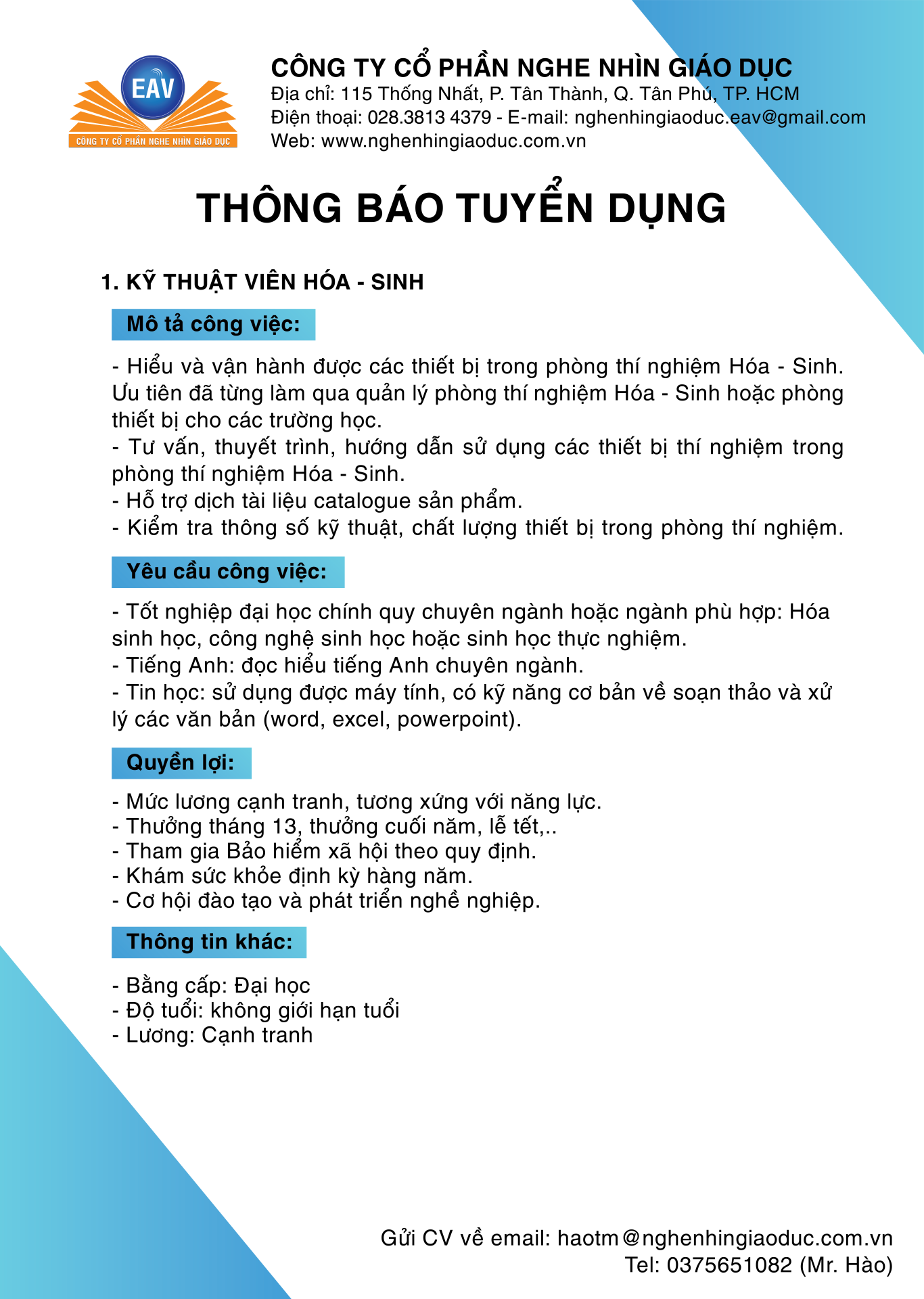 EAV cần tuyển dụng 01 nhân viên vị trí: Kỹ thuật viên Hóa -Sinh